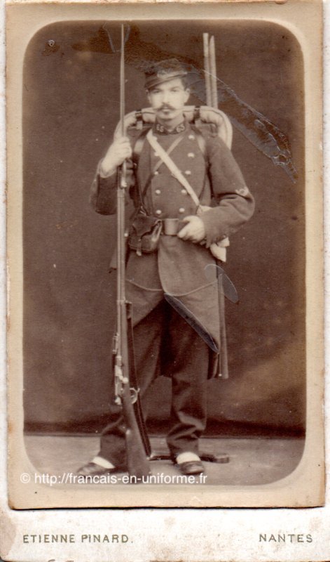 Un coup d'oeil trop rapide nous amènerait à la conclusion que notre photographie est celle d'un soldat de la guerre de 1870 : képi plat, moustache et mouche, guètres blanches, notre soldat est décidément un nostaligique de l'Empire. Pourtant, ce dernier exemple permet d'aborder les années 1880. par ailleurs, les vues de soldats en tenue de campagne avec équipement complet sont moins courantes ce qui rend le cliché d'autant plus intéressant. Notre soldat porte le nouveau fusil Gras distribué à la troupe à partir de 1874 (1). On reconnait également la baïonnette à poignée en bois-laiton (2). Il porte la capote 1867/72 avec manche à double boutons et numéro de régiment au collet (5). En revanche, l'équipement porté est celui d'avant 1870 : la cartouchière modèle 1869 (3), la musette en drap blanc (4) et le havresac complet avec la toile de tente et ses mats bien visibles au dos (6). Enfin notre soldat a gagné un prix de tir comme l'indique l'indigne cousu sur sa manche gauche (7). La datation a été possible grace aux informations concernant le photographe, recoupées avec l'équipement du soldat. En effet la photographie est prise à Nantes où le 65e a été caserné à partir de 1883. Par ailleurs notre photographie a exercé jusqu'en 1887.