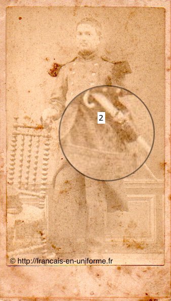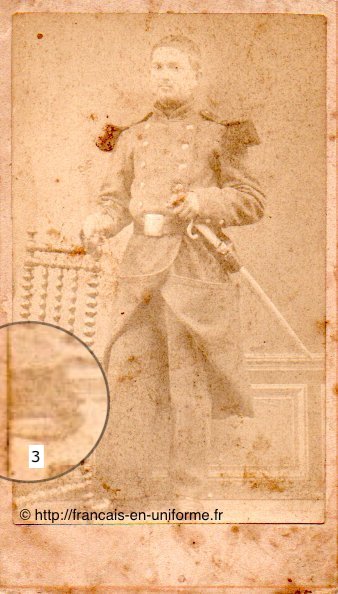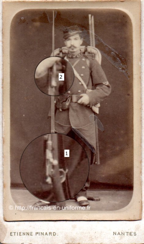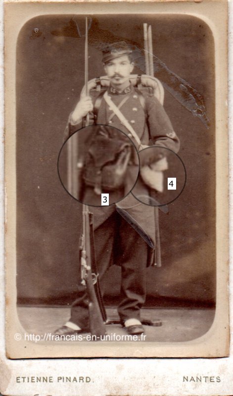 Ce premier cas est intéressant pour traiter de l'uniforme des quelques années qui suivent la guerre de 1870. Un coup d'oeil rapide nous indiquerait un cliché pris pendant la guerre. En effet, notre homme porte la capote modèle 1867 à double boutons de manche et la famause baïonette du fusil chassepot, reconnaissable par son manche en laiton (1) et (2). De plus, il ne semble pas porter de numéro de régiments au collet, mais la mauvaise qualité du cliché a pu altérer cet aspect. Signalons au passage que le cliché est inversé puisque le boutonnage se fait normalement à droite : une inverssion classique de la plaque de verre lors de la reproduction. Cependant, deux détails contredisent cette première observation : Le shako (3) est recouvert de draps et n'arbore plus les insignes du Second Empire. De plus, nous savons que le cliché est pris à Toulon par l'atelier Rampin. Or, il se trouve que le 40e RI se trouvait caserné à Toulon en 1873-1874, ce qui nous donne un indication chronologique. Cela nous permet de souligner que le nouvel équipement a mis du temps à être distribué aux troupes, les anciens continuant à être distribués jusqu'à épuisement des stocks. On se contente souvent d'adapter l'ancien (ajout des numéros de régiment aux collets, retraits des symboles impériaux, changement des boutons d'uniforme en octobre 1871).